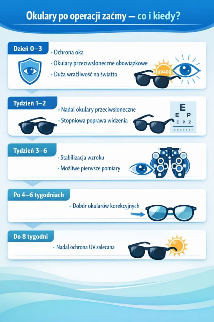 W pierwszych tygodniach po operacji ostrość widzenia może się jeszcze zmieniać, ponieważ oko adaptuje się do nowej soczewki. W tym czasie pomiar wady wzroku nie jest w pełni wiarygodny, dlatego zbyt wczesny dobór okularów może prowadzić do błędnej korekcji. Standardem jest odczekanie do momentu, aż lekarz potwierdzi stabilizację widzenia.